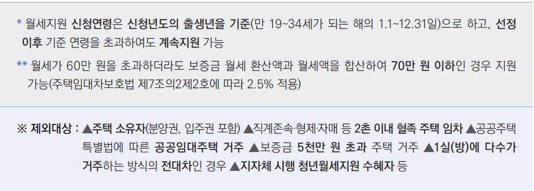 1) 지원대상 : 청년기본법상 청년(만 19~34세 이하)으로 부모님과 별도 거주하고, 임차보증금 5천만 원 및 월세 60만 원
