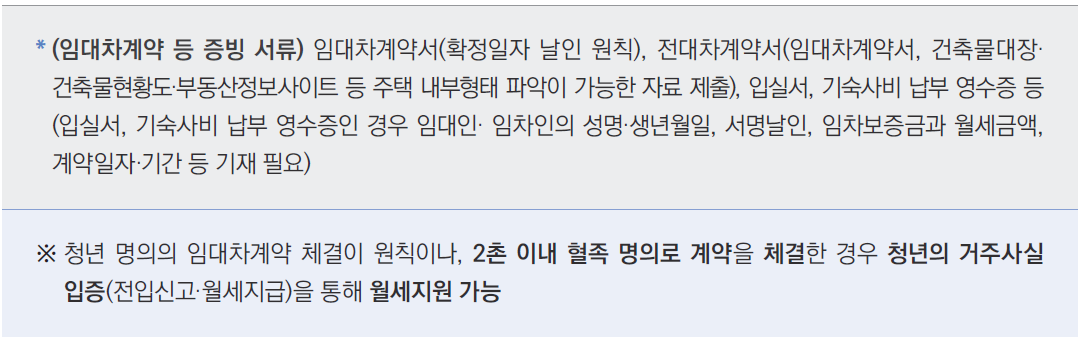 3) 제출서류 : 월세지원 신청(변경)서, 소득·재산 신고서, 임대차계약 및 월세이체 증빙서류, 서약서, 통장 사본, 청년 및