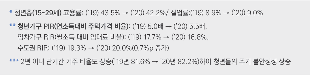 1) 코로나19 장기화로 인한 경제상황 악화로 청년들의 고용 여건에 부정적으로 작용하여 주거비 부담이 가중